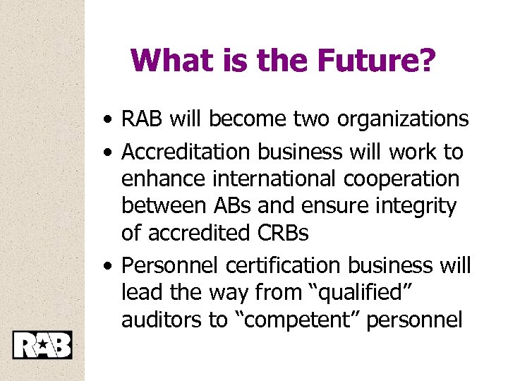 What is the Future? • RAB will become two organizations • Accreditation business will work to enhance international cooperation between ABs and ensure integrity of accredited CRBs • Personnel certification business will lead the way from “qualified” auditors to “competent” personnel