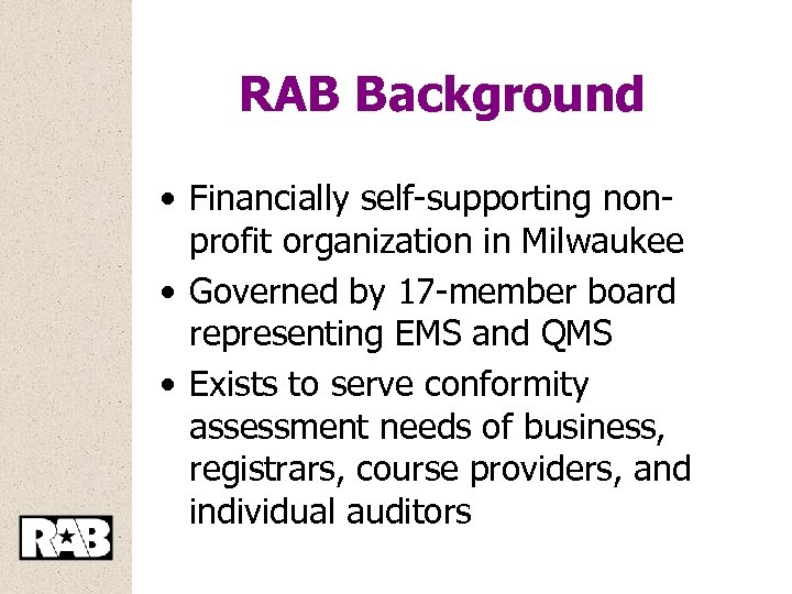 RAB Background • Financially self-supporting nonprofit organization in Milwaukee • Governed by 17 -member board representing EMS and QMS • Exists to serve conformity assessment needs of business, registrars, course providers, and individual auditors