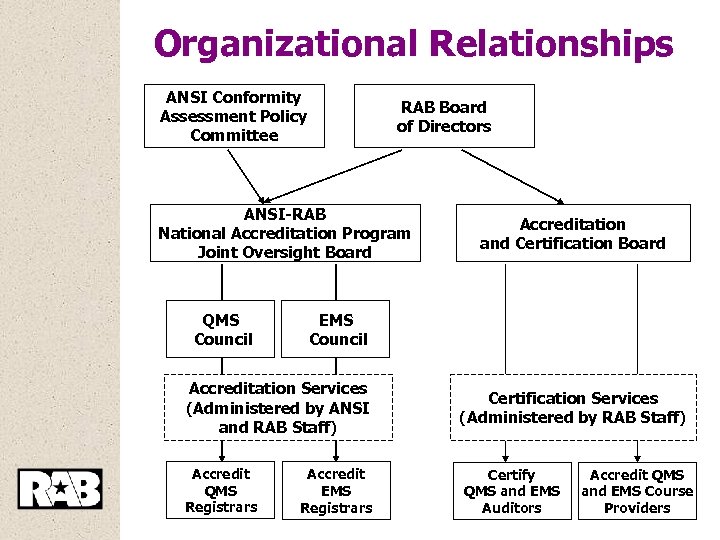 Organizational Relationships ANSI Conformity Assessment Policy Committee RAB Board of Directors ANSI-RAB National Accreditation Program Joint Oversight Board QMS Council EMS Council Accreditation Services (Administered by ANSI and RAB Staff) Accredit QMS Registrars Accreditation and Certification Board Accredit EMS Registrars Certification Services (Administered by RAB Staff) Certify QMS and EMS Auditors Accredit QMS and EMS Course Providers