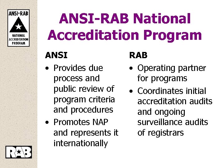 ANSI-RAB National Accreditation Program ANSI • Provides due process and public review of program criteria and procedures • Promotes NAP and represents it internationally RAB • Operating partner for programs • Coordinates initial accreditation audits and ongoing surveillance audits of registrars