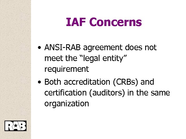 IAF Concerns • ANSI-RAB agreement does not meet the “legal entity” requirement • Both accreditation (CRBs) and certification (auditors) in the same organization