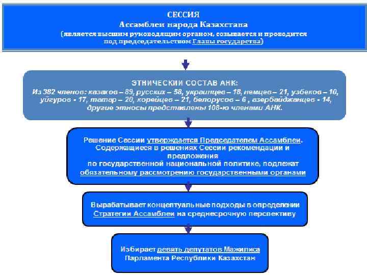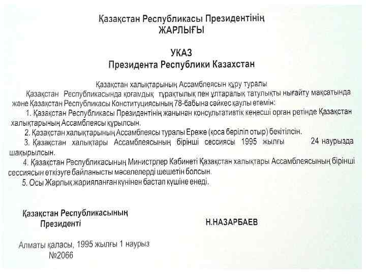 *Сессии Ассамблеи народа Казахстана q 1 учредительная сессия (март 1995 г. )– «За мир и согласие в нашем общем доме» q 2 сессия (июнь 1995 г. ) – «Осмысление пройденного и дальнейшее демократическое реформирование общества» q 3 сессия (апрель 1996 г. ) – «Общественное согласие – основа демократического развития Казахстана» q 4 сессия (июнь 1997 г. ) – «Историческая память, национальное согласие и демократические реформы – гражданский выбор народа Казахстана» q 5 сессия (январь 1999 г. ) – «Национальное согласие – основа стабильности и развития Казахстана» q 6 ссессия (декабрь 1999 г. ) – «В дружбе и согласии в XXI век» q 7 сессия (декабрь 2000 г. ) – «Духовное культурное развитие народа – основа укрепленя государственной независимости Казахстана» q 8 сессия (октябрь 2001 г. ) – « 10 лет Независимости: мир, прогресс и общественное согласие» q 9 сессия (ноябрь 2002 г. ) – «Стратегия развития Ассамблеи народов Казахстана: национальное согласие, безопастность, гражданский мир»