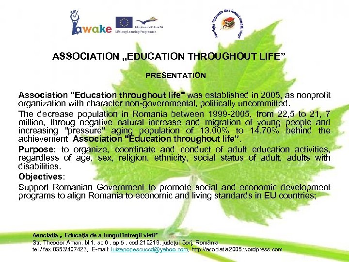 ASSOCIATION „EDUCATION THROUGHOUT LIFE” PRESENTATION Association "Education throughout life" was established in 2005, as nonprofit organization with character non-governmental, politically uncommitted. The decrease population in Romania between 1999 -2005, from 22, 5 to 21, 7 million, throug negative natural increase and migration of young people and increasing "pressure" aging population of 13. 00% to 14. 70% behind the achievement Association "Education throughout life”. Purpose: to organize, coordinate and conduct of adult education activities, regardless of age, sex, religion, ethnicity, social status of adult, adults with disabilities. Objectives: Support Romanian Government to promote social and economic development programs to align Romania to economic and living standards in EU countries; Asociaţia „ Educaţia de a lungul întregii vieţi” Str. Theodor Aman, bl. 1, sc. 6 , ap. 5 , cod 210219, judeţul Gorj, România tel / fax 0353/407423, E-mail: luizapopescuccd@yahoo. com, http: //asociatia 2005. wordpress. com