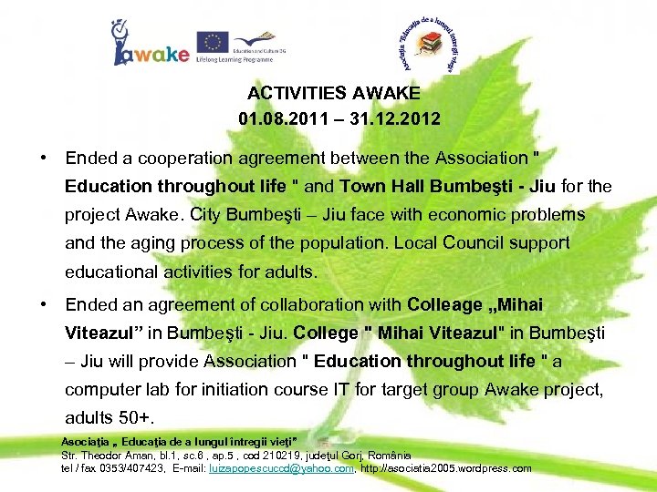 ACTIVITIES AWAKE 01. 08. 2011 – 31. 12. 2012 • Ended a cooperation agreement between the Association " Education throughout life " and Town Hall Bumbeşti - Jiu for the project Awake. City Bumbeşti – Jiu face with economic problems and the aging process of the population. Local Council support educational activities for adults. • Ended an agreement of collaboration with Colleage „Mihai Viteazul” in Bumbeşti - Jiu. College " Mihai Viteazul" in Bumbeşti – Jiu will provide Association " Education throughout life " a computer lab for initiation course IT for target group Awake project, adults 50+. Asociaţia „ Educaţia de a lungul întregii vieţi” Str. Theodor Aman, bl. 1, sc. 6 , ap. 5 , cod 210219, judeţul Gorj, România tel / fax 0353/407423, E-mail: luizapopescuccd@yahoo. com, http: //asociatia 2005. wordpress. com