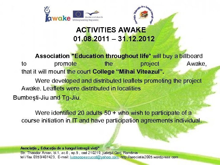ACTIVITIES AWAKE 01. 08. 2011 – 31. 12. 2012 Association "Education throughout life" will buy a billboard to promote the project Awake, that it will mount the court College “Mihai Viteazul”. Were developed and distributed leaflets promoting the project Awake. Leaflets were distributed in localities Bumbeşti-Jiu and Tg-Jiu. Were identified 20 adults 50 + who wish to participate of a course initiation in IT and have participation agreements individual. Asociaţia „ Educaţia de a lungul întregii vieţi” Str. Theodor Aman, bl. 1, sc. 6 , ap. 5 , cod 210219, judeţul Gorj, România tel / fax 0353/407423, E-mail: luizapopescuccd@yahoo. com, http: //asociatia 2005. wordpress. com