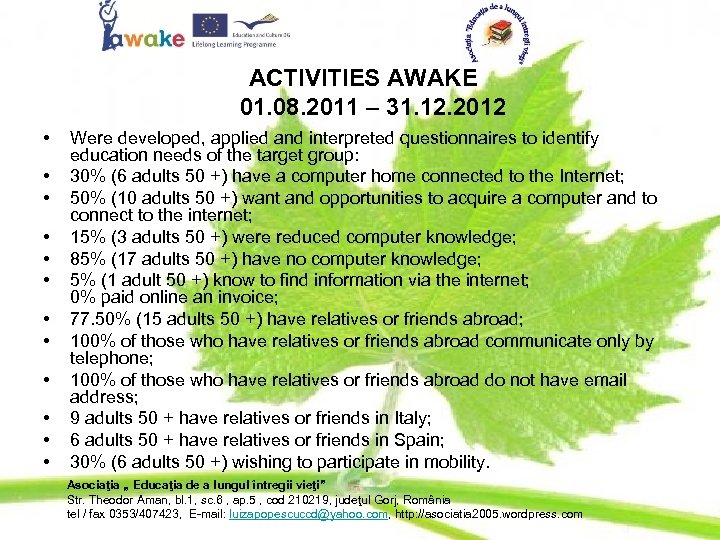 ACTIVITIES AWAKE 01. 08. 2011 – 31. 12. 2012 • • • Were developed, applied and interpreted questionnaires to identify education needs of the target group: 30% (6 adults 50 +) have a computer home connected to the Internet; 50% (10 adults 50 +) want and opportunities to acquire a computer and to connect to the internet; 15% (3 adults 50 +) were reduced computer knowledge; 85% (17 adults 50 +) have no computer knowledge; 5% (1 adult 50 +) know to find information via the internet; 0% paid online an invoice; 77. 50% (15 adults 50 +) have relatives or friends abroad; 100% of those who have relatives or friends abroad communicate only by telephone; 100% of those who have relatives or friends abroad do not have email address; 9 adults 50 + have relatives or friends in Italy; 6 adults 50 + have relatives or friends in Spain; 30% (6 adults 50 +) wishing to participate in mobility. Asociaţia „ Educaţia de a lungul întregii vieţi” Str. Theodor Aman, bl. 1, sc. 6 , ap. 5 , cod 210219, judeţul Gorj, România tel / fax 0353/407423, E-mail: luizapopescuccd@yahoo. com, http: //asociatia 2005. wordpress. com