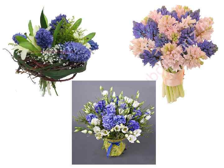 Гиацинт Латинское название: Hyacinthus Семейство: Лилейные (Liliaceae) Ассортимент видов и сортов: на срезку используется один вид - гиацинт восточный (Hyacinthus orientalis) и его разновидности Строение и окраска листьев: ярко-зеленые, сочные, ремневидные, желобчатые, собраны в прикорневую розетку; у гиацинта обычно 4 -8 листьев длиной 9 -20 см, шириной 1 -1, 5 см Стебель: сочный, безлистный, цилиндрический, прямостоячий, от 20 до 45 см высотой Строение цветка: цветки некрупные, колокольчатые, диаметром 2 -3 см, с отогнутыми лепестками (долями околоцветника) и приятным густым ароматом; цветки бывают простые и махровые Строение соцветия: колосовидное соцветие длиной 10 -20 см из 6 -45 цветков Продолжительность жизни в воде: 10 -14 дней Особенности культуры: стебли гиацинта выделяют слизь, которая препятствует поглощению воды, поэтому лучше использовать гиацинты с луковицами или частью луковицы Использование: можно сочетать с нарциссами - слизь, выделяемая нарциссами, не наносит вреда гиацинтам
