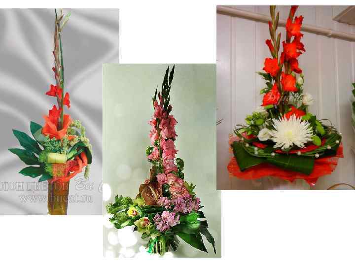 Гладиолус Латинское название: Gladiolus Семейство: Ирисовые (Iridaceae) Особенности культуры: хорошо раскрываются в воде, но цветы, срезанные на стадии начала окрашивания нижнего бутона, будут мельче; цветки откроются лучше, если удалить верхушку соцветия, хотя это портит его общий вид; цветоносы искривляются в направлении света Ассортимент видов и сортов: Gladiolus х hybridus - свыше 10000 сортов; Gladiolus convillei, Gladiolus tubergenii Строение и окраска листьев: зеленые, широколинейные, мечевидные, в количестве 7 -12, обхватывают стебель с обеих сторон; ширина листьев 2 -5 см, длина 60 -80 см Стебель: прямосточий, высотой от 45 до 170 см, облиственный, толстый, диаметром от 1 -2 см у мелкоцветковых до 3 -4 см у крупноцветковых гладиолусов. Строение соцветия: соцветие колос - плотный (лепестки соседних цветков перекрывают друга), среднеплотный (касаются) или рыхлый (цветки находятся на некотором расстоянии друг от друга); цветки могут располагаться в соцветии строго в один или 2 ряда, поочередно с двух сторон цветоноса или по спирали; в соцветии может быть до 20 -24 цветков, длина соцветия может достигать 70 см.