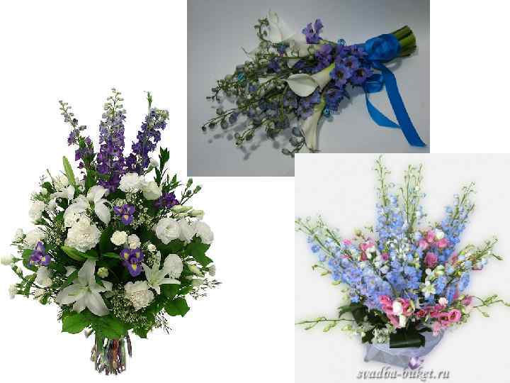 Дельфиниум Ассортимент видов и сортов: на срез Иначе: Живокость, Шпорник выращиваются однолетний дельфиниум Аяксов Латинское название: Delphinium (D. jacis) и многочисленные многоление Семейство: Лютиковые (Ranunculaceae) гибридные сорта, объединенные под названием дельфиниум культурный, или гибридный (D. x cultorum син. D. x hybridum) Группы: из числа гибридных дельфиниумов выращиваются 3 группы сортов: Беладонна - с разветвленным соцветием и сильно рассеченными листьми, немахровыми цветками синего, голубого и белого цвета; Пацифик (Тихоокеанские гибриды) - с высоким плотным пирамидальным соцветием, состоящим из крупных полумахровых цветков, от голубого до фиолетового цвета, белые, розовые и кремовые; Элатум - высокие сорта в сине-голубой гамме Жизненный цикл: многолетник Жизненная форма растения: травянистое Стебель: прямой, полый Строение соцветия: пирамидальная, простая или ветвистая кисть длиной от 50 -80 до 100 см, состоящая из 50 -80(100) цветков; цветки в соцветии раскрываются снизу вверх