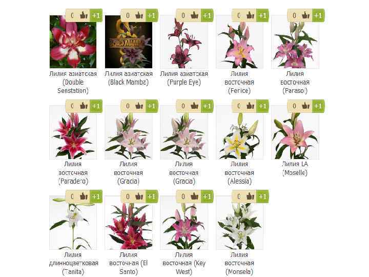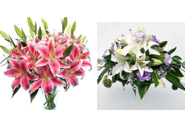 Лилия Латинское название: Lilium Семейство: Лилейные (Liliaceae) Ассортимент видов и сортов: Азиатские гибриды (Az), Восточные гибриды (Or), Трубчатые гибриды, Длинноцветковые гибриды. Строение и окраска листьев: эллиптические, широколанцетные, ланцетные или линейные длиной до 20 см и шириной от 0, 2 до 6 см Строение цветка: цветок с простым околоцветником из шести долей с шестью тычинками и одним пестиком с трехгнездной завязью Строение соцветия: соцветие метелковидное, кистевидное, зонтиковидное или щитковидное Уход и содержание: сразу по прибытии подрезать концы наискось и поставить в воду с добавлением подкормки для срезки; подкормку использовать в половинной дозе, чтобы листья не обесцвечивались; для продления жизни цветов удалить пыльники Особенности культуры: лилии очень чувствительны к этилену, особенно Азиатсткие гибриды - нельзя держать рядом фрукты и овощи; при хранении на листьях не должно быть капель воды