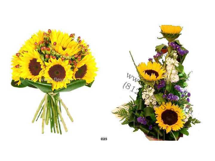 Подсолнечник Латинское название: Helianthus Семейство: Сложноцветные Особенности культуры: не выносит сухого хранения, перевозится в воде; потребляют очень много воды, надо следить за ее уровнем в емкости. Ассортимент видов и сортов: Helianthus annuus, специально для срезки выведена серия гетерозисных гибридов Строение и окраска листьев: крупные, очередные или супротивные, простые, по краю зубчатые Стебель: мощные, от 80 до 250 см высотой Строение соцветия: корзинки многоцветковые: краевые цветки язычковые, однотонные или двухцветные, вынутренние - трубчатые, мелкие, желтые или коричневые