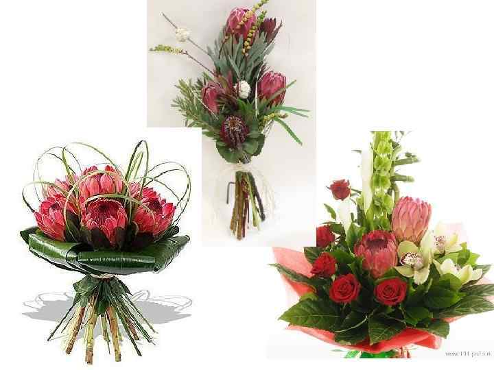 Протея Латинское название: Protea Семейство: Протейные (Proteaceae) Ассортимент видов и сортов: Протея душистая (Protea odorata) Строение соцветия: соцветия по форме напоминают шишки Уход и содержание: со стеблей протеи удаляются почти все листья; используется только чистая вода; рекомендуется добавлять в воду специальную подкормку для протеи; нельзя использовать хлорин Особенности культуры: срезка протеи потребляет большое количество воды, поэтому нужно следить за уровнем воды в емкости Использование: из-за высокого потребления воды не используется для композиций на оазисе, а только для постановки в вазы(стебли должны быть в воде)