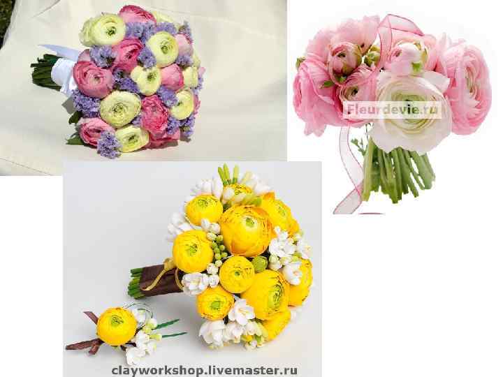 Ранункулюс Иначе: Лютик Латинское название: Ranunculus Семейство: Лютиковые (Ranunculaceae) Ассортимент видов и сортов: Лютик азиатский или Лютик садовый (Ranunculus asiaticus) Уход и содержание: при сухом хранении теряют яркость цвета; укорачивание стеблей проводят в воде; используют только чистые ведра и воду, которую регулярно доливают; обязательно использование подкормки для цветов, это предупреждает пожелтение листьев и продлевает срок свежести Особенности культуры: ранункулюс продолжает рост в воде, поэтому стебли могут обвисать; потребляет большое количество воды; боится сквозняков; страдает от ботритиса, поэтому необходимо соблюдение в помещении низкой влажности и своевременное удаление пораженных цветов;