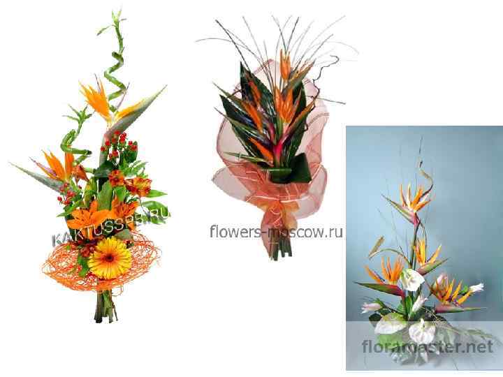 Стрелиция Иначе: Стрелитция Обиходное название: Райская птица Латинское название: Strelitzia Семейство: Стрелициевые (Strelitziaceae) Ассортимент видов и сортов: Стрелиция королевская (Strelitzia reginae) Строение и окраска листьев: поставляется без листьев Стебель: цветонос прочный, голый, высокий - 70 -150 см Строение цветка: цветки напоминают экзотическую птицу, имеют оранжевые чашелистики (от 4 до 6) и синефиолетовые лепестки, собранные по 3 -8 в соцветие Особенности культуры: хорошо хранится даже при комнатной температуре; при температуре ниже +12 градусов происходит потеря окраски; нераспущенный цветок можно раскрыть руками