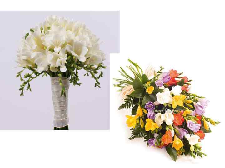 Фрезия Латинское название: Freesia Семейство: Ирисовые (Iridaceae) Ассортимент видов и сортов: Freesia hybrida Строение и окраска листьев: имеет мечевидные, мягкие, поникающие листь трех видов: низовые, влагалищные (3 -4 шт. ) видны над почвой только верхушками; срединные, клубнелуковичные (от 5 -6 до 13 шт. ) нижней частью прилегают к клубнелуковице; верховые (1 -4 шт. ) расположены на цветоносном побеге Строение цветка: цветки воронковидные или трубчатые, с чудесным запахом; есть махровые сорта