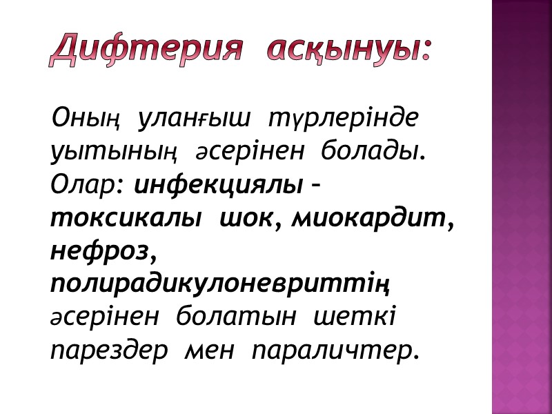 Дифтерия асқынуы: Оның уланғыш түрлерінде уытының әсерінен болады. Олар: инфекциялы – токсикалы шок, миокардит, нефроз, полирадикулоневриттің әсерінен болатын шеткі парездер мен параличтер.