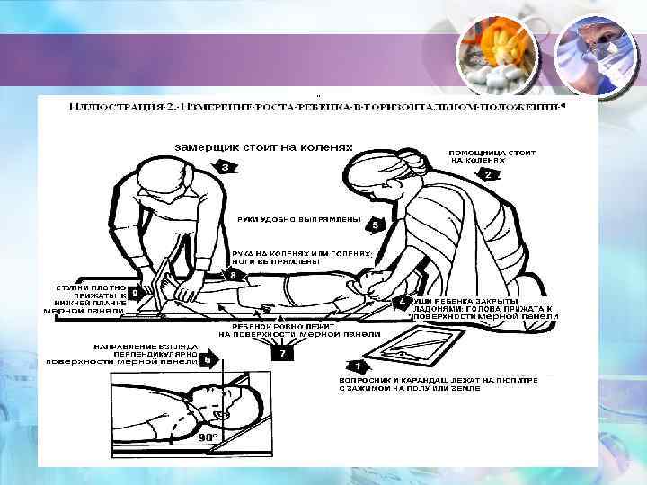 Балалардың бойын өлшеу Ø 1 -жасқа дейінгі балалардың бойын горизонтальды бой өлшегішпен анытайды Ø Күндізгі уақытта жүргізілуі тиісті; Ø Аяқтары түзу, тізелері жазылған ауқытта; Ø Өкшелері өлшегіштің аяқ перегородкасына , ал башпайлары жоғары қарап тұруы керек; • 1 жастан үлкен балалардың бойын вертикальды бой өлшегішпен анықтайды. Ø Күндізгі уақытта жүргізілуі тиісті; Ø Бала жалан аяқ, бас киімсіз, табандары толығымен еденде болып, балалардың өкшесі, бөксесі және жауырындары бой өлшегішке тікелей жанасуы қажет; Ø Бастың орналасуы келесідей болуы керек- көз бен құлақтың жоғарғы қыры бір горизонталды сызықта болған шарт.
