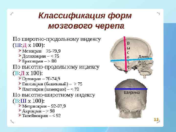Краниометрия-деп бас сүйектің өлшемдерін айтады. Оның: • Вертикальды, • беттік, • латеральды, • шүйделік, • базиллярлық нормалары болады. Бас сүйектерінің бір-бірімен байланыстары: • жіктер • буындар түрінде болады. Сүйек байланыстары туралы ілім синдесмология деп аталады. (латынша синбайланыс, десмо-байлам, логос –ғылым деген сөздер) Сүйектердің байланысу түрлерін 3 топқа бөлуге болады: 1. қозғалыссыз немесе синартрозды байланыстар 2. қозғалмалы, буын немесе диартрозды байланыстар 3. жартылай буынды немесе симфиз
