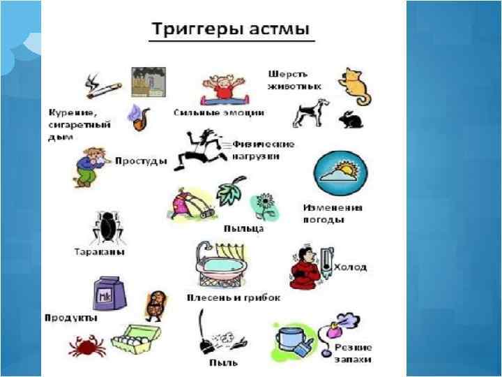 Внешние факторы 1. Аллергены: аллергены помещении : клещи домашнеи пыли, шерсть домашних животных (собак, кошек, мышеи ), аллергены тараканов, грибы, в том числе плесневые и дрожжевые внешние аллергены: пыльца, грибы, в том числе плесневые и дрожжевые 2. Инфекции (главным образом, вирусные (РСВ)) 3. Профессиональные сенсибилизаторы 5. Пассивное, активное курение 7. Загрязнение воздуха внутри и снаружи помещении 8. Питание (искусственное увеличивает риск р-я БА)