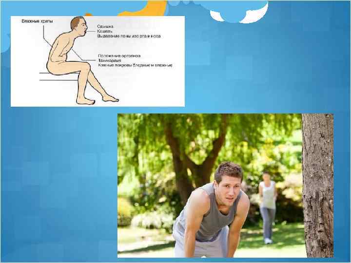 Астматический статус Клиника 1. Положение пациента – ортопноэ с фиксацией руками верхнего плечевого пояса, активное участи мышц брюшного пресса, плечевого пояса и грудной клетки акте дыхания 2. Горизонтальное положение ребер, Сглаженность межреберных промежутков 3. Кашель с отделением скудного вязкого секрета 4. Потливость 5. Цианоз 6. Аускультация: резкое ослабление дыхания преимущественно в нижних отделах легких, хрипы, в более тяжелых случаях – полное отсутствие бронхиальной проводимости ( «немое легкое» ) 7. Может быть резкое повышение АД, ЧСС и парадоксальный пульс