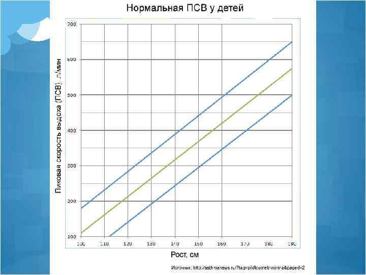 Пикфлоуметрия § Показана при подозрении на астму у детей старше 5 лет § Измеряет единственный параметр – пиковую скорость выдоха – ПСВ