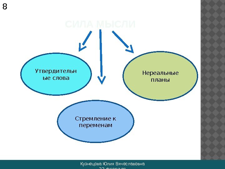 СИЛА МЫСЛИ Кузнецова Юлия Вячеславовна 22 февраля 8 Утвердительн ые слова Нереальные планы Стремление к переменам
