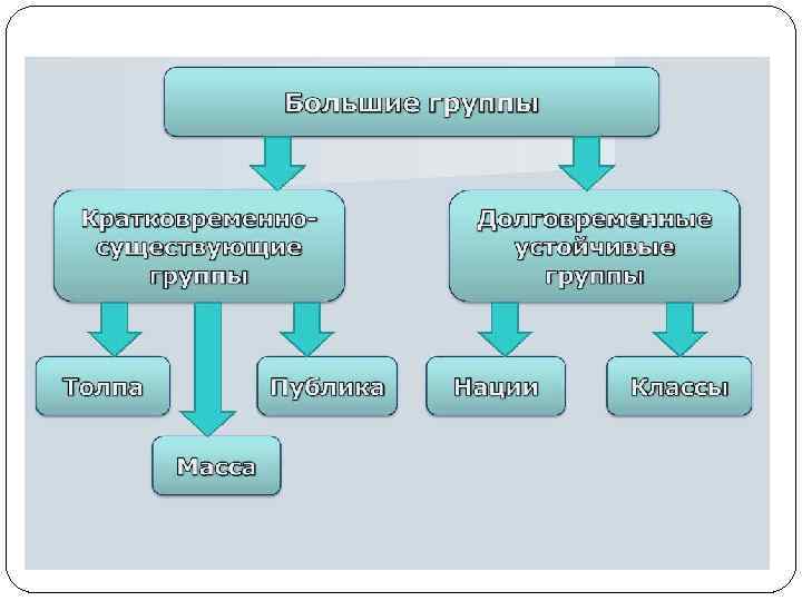 Большая группа - значительная по масштабам (численности) совокупность людей, не имеющих между собой непосредственных контактов, но объединенных осознанием принадлежности к группе, образом жизни, общей психологией, обычаями и традициями: нация, класс, сословие, этническая общность и другие. Кузнецова Юлия Вячеславовна 29 марта