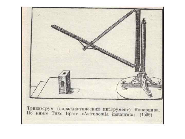 Об инструментах и точности наблюдений Коперника • Коперник имел в своем распоряжении те же наблюдательные данные, что и Птолемей (оценки Аристарха, уточненные Гиппархом). Он лишь немного еще "уточняет" эти величины, остающиеся весьма далекими от истинных значений. • Инструменты у Коперника были столь же примитивны (не в пример среднеазиатским!), а точность наблюдений (с ошибками в 40’!) намного ниже, чем у Гиппарха и Птолемея. Общее число наблюдений – несколько десятков. • Главным был теоретический анализ проблемы!