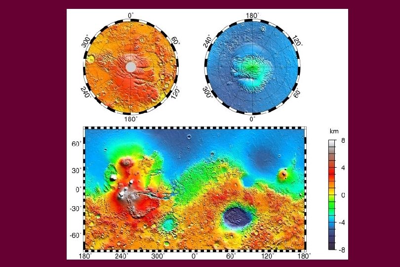 • blue is low • red/white are high • These two hemispheres are centered on the Tharsis plateau (including the Valles Marineris and the large volcanos) and on the Isidis impact basin (with the Hellas basin to the south)