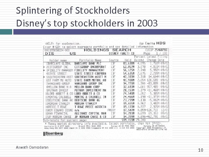 6 Application Test: Who owns/runs your firm? Look at: Bloomberg printout HDS for your firm Who are the top stockholders in your firm? What are the potential conflicts of interests that you see emerging from this stockholding structure? B HDS Page PB Page 3 -12 Aswath Damodaran 9