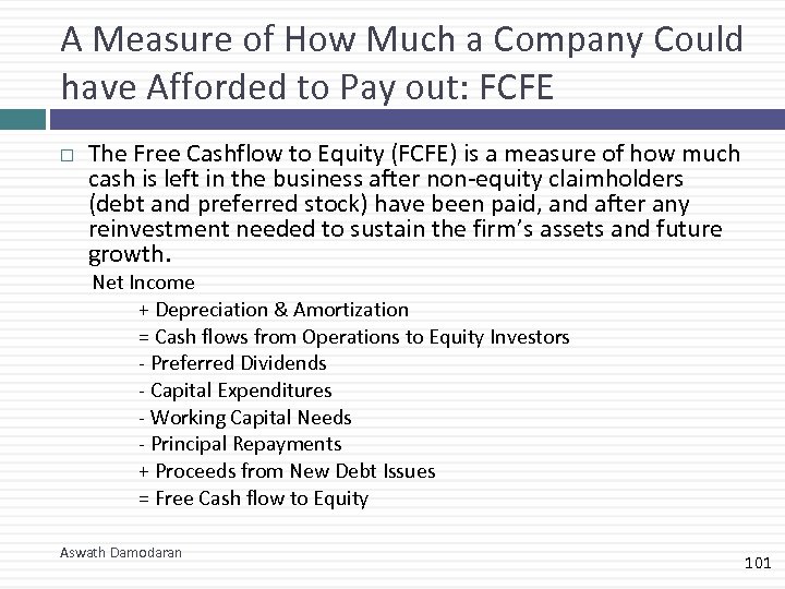 A Measure of How Much a Company Could have Afforded to Pay out: FCFE The Free Cashflow to Equity (FCFE) is a measure of how much cash is left in the business after non-equity claimholders (debt and preferred stock) have been paid, and after any reinvestment needed to sustain the firm’s assets and future growth. Net Income + Depreciation & Amortization = Cash flows from Operations to Equity Investors - Preferred Dividends - Capital Expenditures - Working Capital Needs - Principal Repayments + Proceeds from New Debt Issues = Free Cash flow to Equity Aswath Damodaran 101