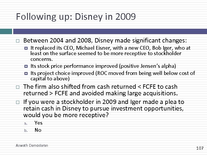 Following up: Disney in 2009 Between 2004 and 2008, Disney made significant changes: It replaced its CEO, Michael Eisner, with a new CEO, Bob Iger, who at least on the surface seemed to be more receptive to stockholder concerns. Its stock price performance improved (positive Jensen’s alpha) Its project choice improved (ROC moved from being well below cost of capital to above) The firm also shifted from cash returned < FCFE to cash returned > FCFE and avoided making large acquisitions. If you were a stockholder in 2009 and Iger made a plea to retain cash in Disney to pursue investment opportunities, would you be more receptive? a. b. Yes No Aswath Damodaran 107