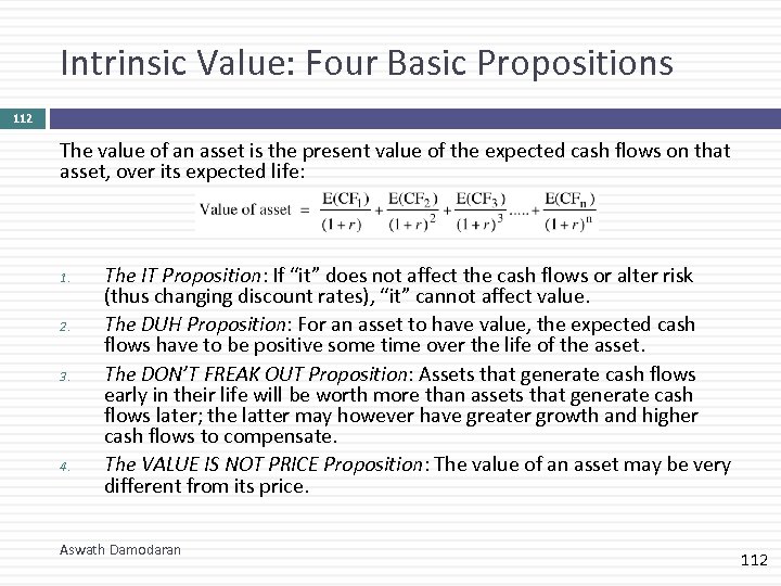 Intrinsic Value: Four Basic Propositions 112 The value of an asset is the present value of the expected cash flows on that asset, over its expected life: 1. 2. 3. 4. The IT Proposition: If “it” does not affect the cash flows or alter risk (thus changing discount rates), “it” cannot affect value. The DUH Proposition: For an asset to have value, the expected cash flows have to be positive some time over the life of the asset. The DON’T FREAK OUT Proposition: Assets that generate cash flows early in their life will be worth more than assets that generate cash flows later; the latter may however have greater growth and higher cash flows to compensate. The VALUE IS NOT PRICE Proposition: The value of an asset may be very different from its price. Aswath Damodaran 112