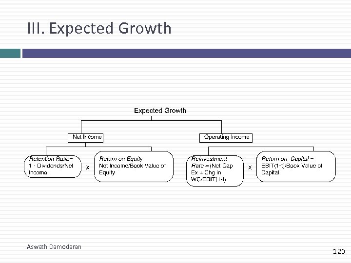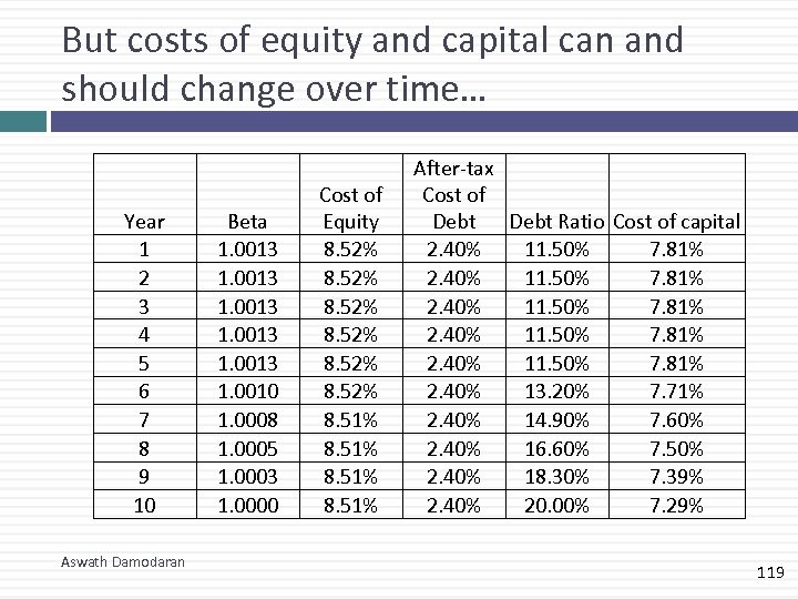 But costs of equity and capital can and should change over time… Year 1 2 3 4 5 6 7 8 9 10 Aswath Damodaran Beta 1. 0013 1. 0010 1. 0008 1. 0005 1. 0003 1. 0000 Cost of Equity 8. 52% 8. 51% After-tax Cost of Debt Ratio Cost of capital 2. 40% 11. 50% 7. 81% 2. 40% 13. 20% 7. 71% 2. 40% 14. 90% 7. 60% 2. 40% 16. 60% 7. 50% 2. 40% 18. 30% 7. 39% 2. 40% 20. 00% 7. 29% 119