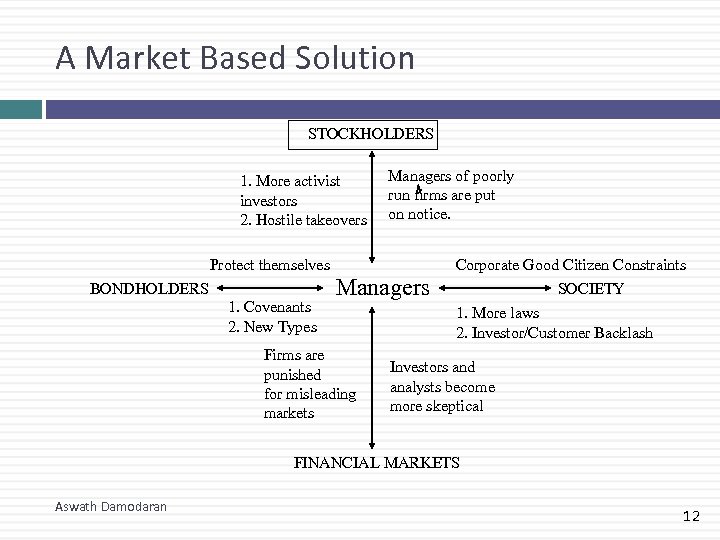 When traditional corporate financial theory breaks down, the solution is: To choose a different mechanism for corporate governance, i. e. , assign the responsibility for monitoring managers to someone other than stockholders. To choose a different objective for the firm. To maximize stock price, but reduce the potential for conflict and breakdown: Making managers (decision makers) and employees into stockholders Protect lenders from expropriation By providing information honestly and promptly to financial markets Minimize social costs Aswath Damodaran 11