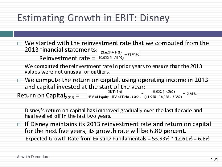 Estimating Growth in EBIT: Disney We started with the reinvestment rate that we computed from the 2013 financial statements: Reinvestment rate = We computed the reinvestment rate in prior years to ensure that the 2013 values were not unusual or outliers. We compute the return on capital, using operating income in 2013 and capital invested at the start of the year: Return on Capital 2013 = Disney’s return on capital has improved gradually over the last decade and has levelled off in the last two years. If Disney maintains its 2013 reinvestment rate and return on capital for the next five years, its growth rate will be 6. 80 percent. Expected Growth Rate from Existing Fundamentals = 53. 93% * 12. 61% = 6. 8% Aswath Damodaran 121