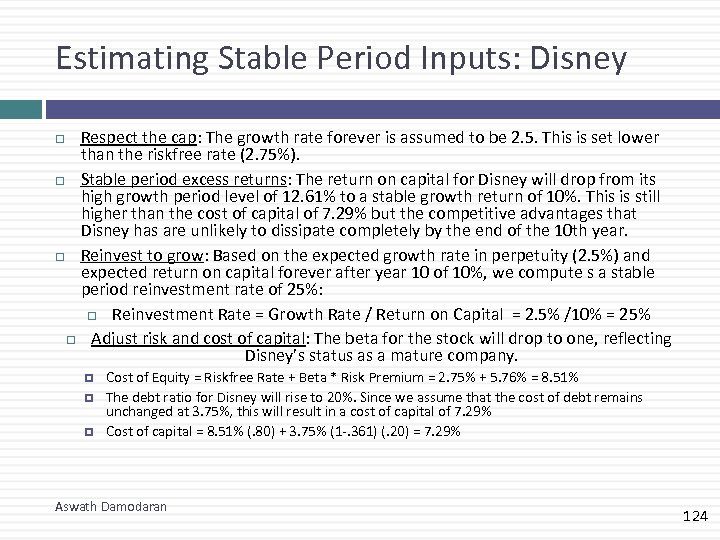 Estimating Stable Period Inputs: Disney Respect the cap: The growth rate forever is assumed to be 2. 5. This is set lower than the riskfree rate (2. 75%). Stable period excess returns: The return on capital for Disney will drop from its high growth period level of 12. 61% to a stable growth return of 10%. This is still higher than the cost of capital of 7. 29% but the competitive advantages that Disney has are unlikely to dissipate completely by the end of the 10 th year. Reinvest to grow: Based on the expected growth rate in perpetuity (2. 5%) and expected return on capital forever after year 10 of 10%, we compute s a stable period reinvestment rate of 25%: Reinvestment Rate = Growth Rate / Return on Capital = 2. 5% /10% = 25% Adjust risk and cost of capital: The beta for the stock will drop to one, reflecting Disney’s status as a mature company. Cost of Equity = Riskfree Rate + Beta * Risk Premium = 2. 75% + 5. 76% = 8. 51% The debt ratio for Disney will rise to 20%. Since we assume that the cost of debt remains unchanged at 3. 75%, this will result in a cost of capital of 7. 29% Cost of capital = 8. 51% (. 80) + 3. 75% (1 -. 361) (. 20) = 7. 29% Aswath Damodaran 124