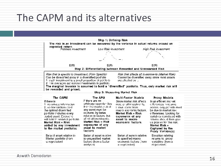 What is Risk? Risk, in traditional terms, is viewed as a ‘negative’. Webster’s dictionary, for instance, defines risk as “exposing to danger or hazard”. The Chinese symbols for risk, reproduced below, give a much better description of risk: 危机 The first symbol is the symbol for “danger”, while the second is the symbol for “opportunity”, making risk a mix of danger and opportunity. You cannot have one, without the other. Risk is therefore neither good nor bad. It is just a fact of life. The question that businesses have to address is therefore not whether to avoid risk but how best to incorporate it into their decision making. Aswath Damodaran 15