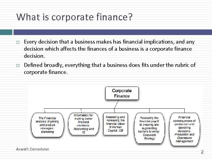 What is corporate finance? Every decision that a business makes has financial implications, and any decision which affects the finances of a business is a corporate finance decision. Defined broadly, everything that a business does fits under the rubric of corporate finance. Aswath Damodaran 2