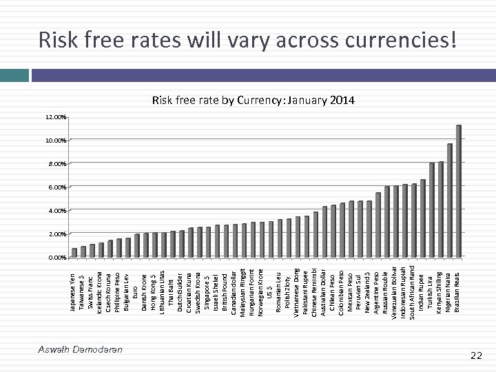 What if there is no default-free entity? Risk free rates in November 2013 PB Page 14 -21 If the government is perceived to have default risk, the government bond rate will have a default spread component in it and not be riskfree. There are three choices we have, when this is the case. Adjust the local currency government borrowing rate for default risk to get a riskless local currency rate. In May 2014, the Russian Government Bond rate in rubles = 8. 82% The Russian local currency rating was Baa 1, with a default spread of 1. 6%. However, the sovereign CDS spread for Russia in May 2014 was 2. 45%. Riskfree rate in Russian Rubles = 8. 82% - 2. 45%= 6. 37% Do the analysis in an alternate currency, where getting the riskfree rate is easier, say the US dollar. The riskfree rate is then the US treasury bond rate. Do your analysis in real terms, in which case the riskfree rate has to be a real riskfree rate. The inflation-indexed treasury rate is a measure of a real riskfree rate. Aswath Damodaran 21