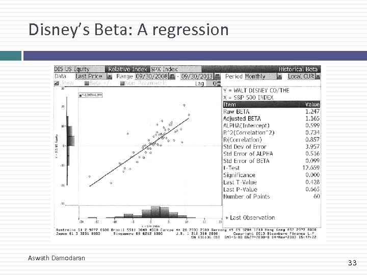 Estimating Beta The standard procedure for estimating betas is to regress stock returns (Rj) against market returns (Rm) Rj = a + b Rm where a is the intercept and b is the slope of the regression. The slope of the regression corresponds to the beta of the stock, and measures the riskiness of the stock. The R squared (R 2) of the regression provides an estimate of the proportion of the risk (variance) of a firm that can be attributed to market risk. The balance (1 - R 2) can be attributed to firm specific risk. Aswath Damodaran 32
