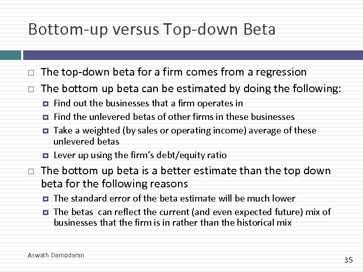 Bottom-up versus Top-down Beta The top-down beta for a firm comes from a regression The bottom up beta can be estimated by doing the following: Find out the businesses that a firm operates in Find the unlevered betas of other firms in these businesses Take a weighted (by sales or operating income) average of these unlevered betas Lever up using the firm’s debt/equity ratio The bottom up beta is a better estimate than the top down beta for the following reasons The standard error of the beta estimate will be much lower The betas can reflect the current (and even expected future) mix of businesses that the firm is in rather than the historical mix Aswath Damodaran 35