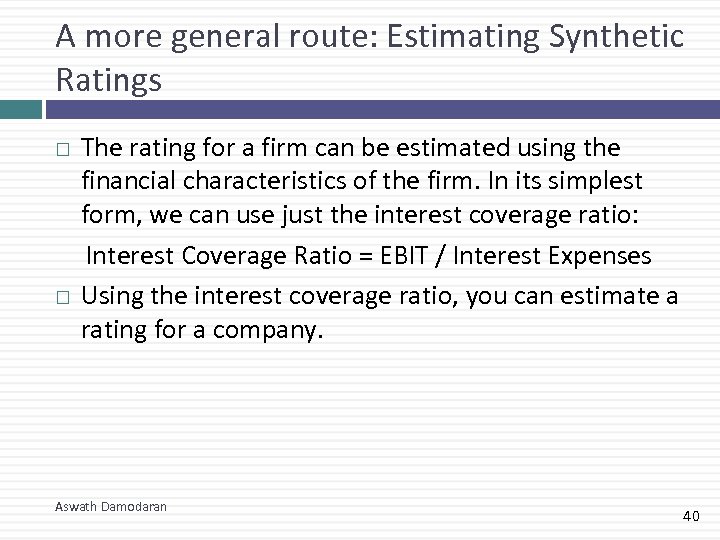 Estimating the Cost of Debt If the firm has bonds outstanding, and the bonds are traded, the yield to maturity on a long-term, straight (no special features) bond can be used as the interest rate. If the firm is rated, use the rating and a typical default spread on bonds with that rating to estimate the cost of debt. If the firm is not rated, and it has recently borrowed long term from a bank, use the interest rate on the borrowing or estimate a synthetic rating for the company, and use the synthetic rating to arrive at a default spread and a cost of debt The cost of debt has to be estimated in the same currency as the cost of equity and the cash flows in the valuation. Aswath Damodaran 39
