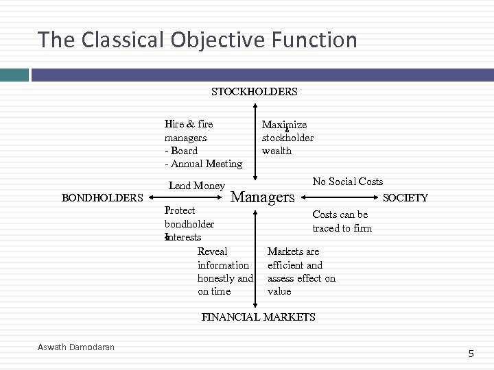 The Objective in Decision Making In traditional corporate finance, the objective in decision making is to maximize the value of the firm. A narrower objective is to maximize stockholder wealth. When the stock is traded and markets are viewed to be efficient, the objective is to maximize the stock price. Maximize firm value Aswath Damodaran Maximize equity value Maximize market estimate of equity value 4