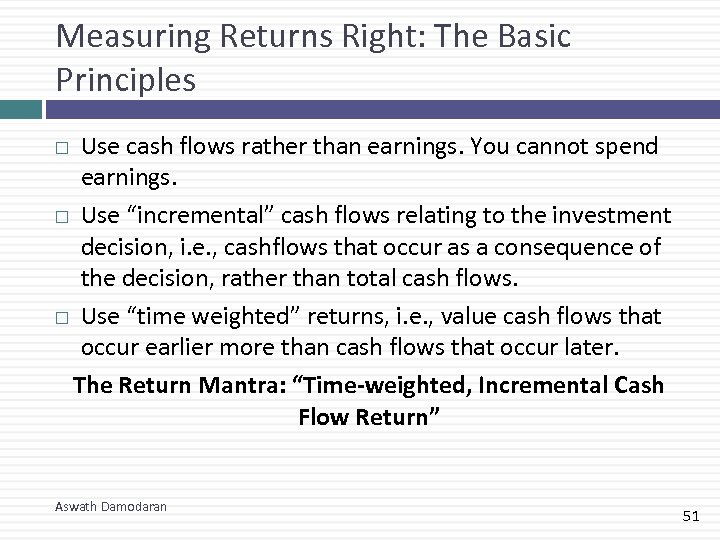 Measures of return: earnings versus cash flows Principles Governing Accounting Earnings Measurement Accrual Accounting: Show revenues when products and services are sold or provided, not when they are paid for. Show expenses associated with these revenues rather than cash expenses. Operating versus Capital Expenditures: Only expenses associated with creating revenues in the current period should be treated as operating expenses. Expenses that create benefits over several periods are written off over multiple periods (as depreciation or amortization) To get from accounting earnings to cash flows: you have to add back non-cash expenses (like depreciation) you have to subtract out cash outflows which are not expensed (such as capital expenditures) you have to make accrual revenues and expenses into cash revenues and expenses (by considering changes in working capital). Aswath Damodaran 50