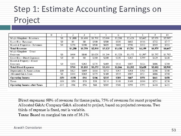 Step 1: Estimate Accounting Earnings on Project Direct expenses: 60% of revenues for theme parks, 75% of revenues for resort properties Allocated G&A: Company G&A allocated to project, based on projected revenues. Two thirds of expense is fixed, rest is variable. Taxes: Based on marginal tax rate of 36. 1% Aswath Damodaran 53