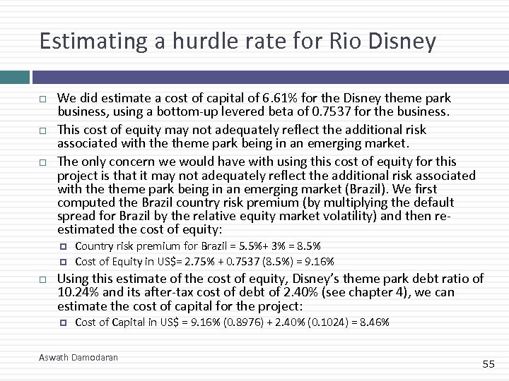 Estimating a hurdle rate for Rio Disney We did estimate a cost of capital of 6. 61% for the Disney theme park business, using a bottom-up levered beta of 0. 7537 for the business. This cost of equity may not adequately reflect the additional risk associated with theme park being in an emerging market. The only concern we would have with using this cost of equity for this project is that it may not adequately reflect the additional risk associated with theme park being in an emerging market (Brazil). We first computed the Brazil country risk premium (by multiplying the default spread for Brazil by the relative equity market volatility) and then reestimated the cost of equity: Country risk premium for Brazil = 5. 5%+ 3% = 8. 5% Cost of Equity in US$= 2. 75% + 0. 7537 (8. 5%) = 9. 16% Using this estimate of the cost of equity, Disney’s theme park debt ratio of 10. 24% and its after-tax cost of debt of 2. 40% (see chapter 4), we can estimate the cost of capital for the project: Cost of Capital in US$ = 9. 16% (0. 8976) + 2. 40% (0. 1024) = 8. 46% Aswath Damodaran 55