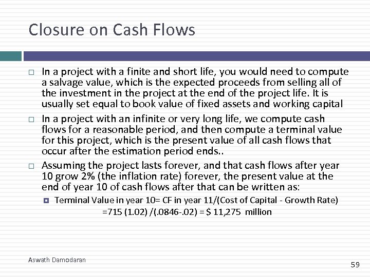 Closure on Cash Flows In a project with a finite and short life, you would need to compute a salvage value, which is the expected proceeds from selling all of the investment in the project at the end of the project life. It is usually set equal to book value of fixed assets and working capital In a project with an infinite or very long life, we compute cash flows for a reasonable period, and then compute a terminal value for this project, which is the present value of all cash flows that occur after the estimation period ends. . Assuming the project lasts forever, and that cash flows after year 10 grow 2% (the inflation rate) forever, the present value at the end of year 10 of cash flows after that can be written as: Terminal Value in year 10= CF in year 11/(Cost of Capital - Growth Rate) =715 (1. 02) /(. 0846 -. 02) = $ 11, 275 million Aswath Damodaran 59