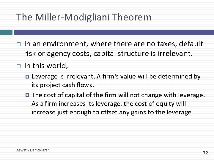The Miller-Modigliani Theorem In an environment, where there are no taxes, default risk or agency costs, capital structure is irrelevant. In this world, Leverage is irrelevant. A firm's value will be determined by its project cash flows. The cost of capital of the firm will not change with leverage. As a firm increases its leverage, the cost of equity will increase just enough to offset any gains to the leverage Aswath Damodaran 72