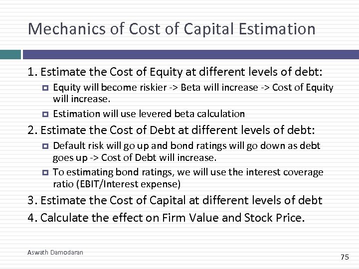 Mechanics of Cost of Capital Estimation 1. Estimate the Cost of Equity at different levels of debt: Equity will become riskier -> Beta will increase -> Cost of Equity will increase. Estimation will use levered beta calculation 2. Estimate the Cost of Debt at different levels of debt: Default risk will go up and bond ratings will go down as debt goes up -> Cost of Debt will increase. To estimating bond ratings, we will use the interest coverage ratio (EBIT/Interest expense) 3. Estimate the Cost of Capital at different levels of debt 4. Calculate the effect on Firm Value and Stock Price. Aswath Damodaran 75